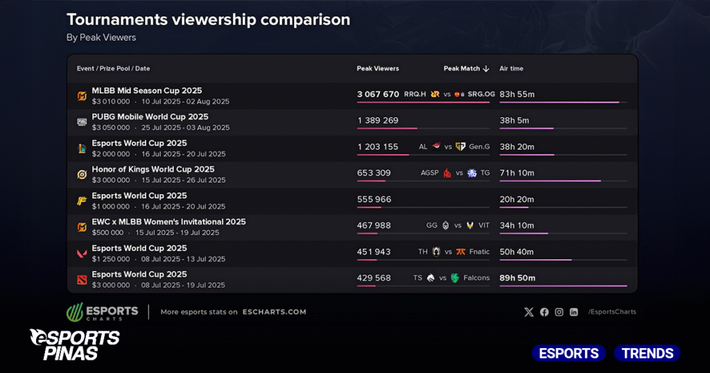 - The MLBB Mid Season Cup 2025 was the most watched tournament in EWC history, with a peak viewership of 3 million.